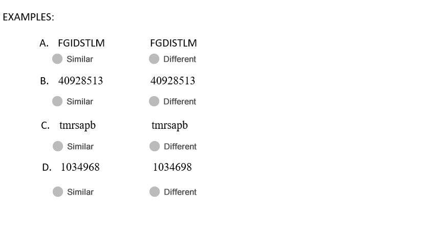 This test contains 50 pairs of letters or numbers, which are either similar or different. If the pair is exactly the same, mark the S box. If the pair is different in any way, mark the D box