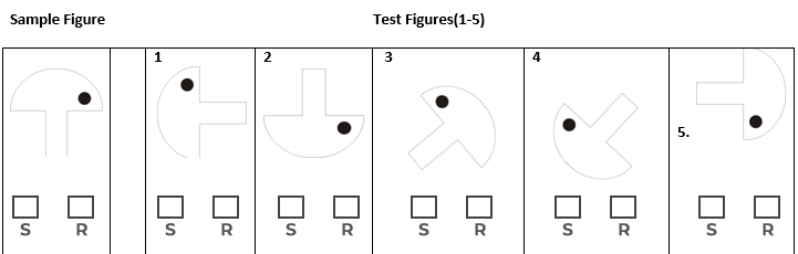 In some cases, the test figure will be reversed, that is turned “over” and turned “around”. Identify whether the given test figure is the same (S) or reversed (R) from the sample figure and mark the box “S” or “R”. Be sure to mark S or R for each of the test figure in each row.